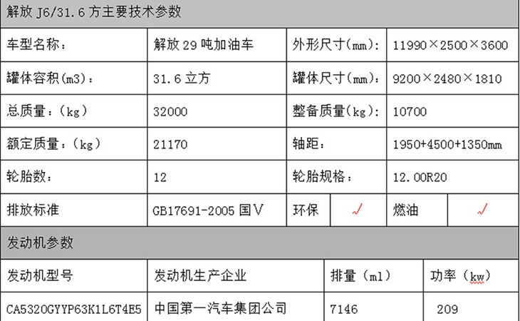 解放J6M高頂雙臥豪華駕駛室,大柴285馬力國(guó)五發(fā)動(dòng)機(jī)(FCRI+SCR氣驅(qū)、雙腔空壓機(jī)),解放九檔變速箱(法蘭輸出取力器),440后橋,12R22.5型(鋁合金輪輞),自動(dòng)空調(diào)、300L鋁油箱、鐵保險(xiǎn)杠、高效單空濾、鋁散熱器、駕駛室后兩點(diǎn)空氣懸置、電動(dòng)液壓舉升裝置、懸架為前少/后氣囊、前后盤(pán)式制動(dòng)器、排氣尾管前置、車輛限速裝置、排氣火花熄滅器、整車配備靜電拖地帶2根、150Ah蓄電池、前下防護(hù)裝置。
